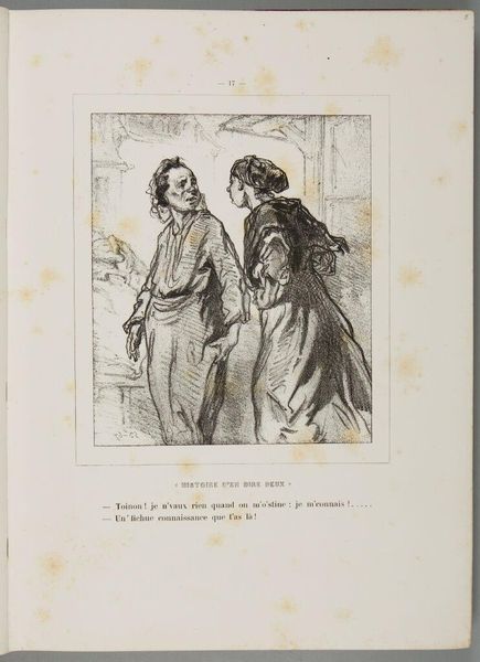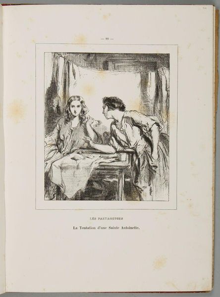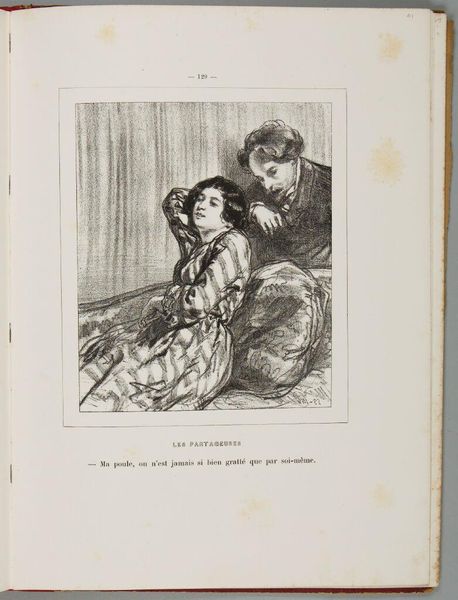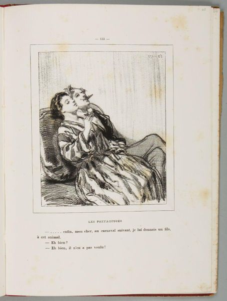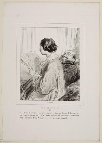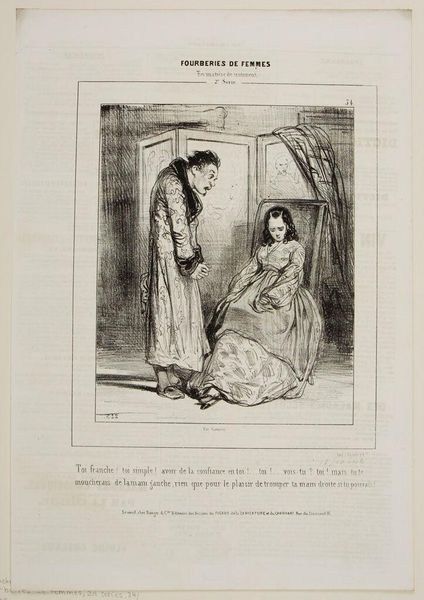 Curator: Let's talk about this satirical print by Paul Gavarni, its full title a real mouthful: "Thursday, you dined at Vachette's, with a grand Monsieur… That's a joke! Yes, he's the touching Némorin of which I am the Estelle, for a quarter of an hour. He has only one eye, that man: it's equal, he displeases me!" Editor: My first impression is intrigue, mixed with a touch of melancholy, the way the light captures the model's face makes her look trapped and jaded. Curator: Yes, Gavarni often depicted the complexities of Parisian life, especially the social dynamics between men and women. You can tell by the title the relationship is not ideal. Editor: The artist's 'single eye' could be interpreted as a symbol of a limited perspective or perhaps a skewed view of women. Curator: I agree, it's about power dynamics, the commodification of relationships, the fleeting nature of affection... It's both witty and a little sad. Editor: It leaves you wondering, doesn’t it, about the stories behind the faces of these figures, caught in a moment of social commentary.