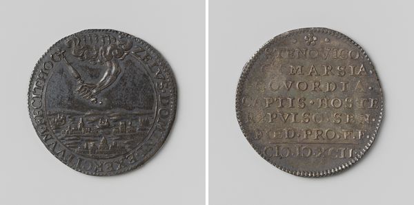 Curator: Here we have "Stad Kampen," a carved metal relief from 1597, attributed to Hendrik Wijntgens. What are your initial thoughts? Editor: Well, there's an undeniable austerity to it. The metallic sheen and somewhat rigid geometric shapes suggest a certain formality and distance. It's very symmetrical. Curator: Indeed. The composition is meticulously structured, featuring concentric rings of text surrounding a central image on each side. The front seems to depict the cityscape itself, framed by ornate detailing, whereas the rear features text and decorative scrollwork. Editor: Yes, and the very choice of metal points to its significance. Was it designed to commemorate some key event? These kinds of materials carry connotations of wealth, permanence, and power. Who was the intended audience for this piece, and how might it have reinforced the existing social hierarchy? Curator: It's possible it was made to commemorate something of significance, perhaps linked to trade. Technically, consider how the artist uses the shallow depth to suggest spatial complexity. Note, too, the precise linework. Even in this small format, Wijntgens has managed to convey a strong sense of depth and detail. The play of light and shadow across the relief enhances this effect, drawing the viewer's eye into the intricate details. Editor: I see that detail, yes, but the city seems idealized – absent of people or the dynamism of actual lived life. How might this idealized representation of Kampen, literally ‘stamped’ onto this object, reinforce particular narratives of civic identity? Curator: Perhaps. It's interesting to consider the object's inherent qualities alongside its potential cultural significance. Editor: Exactly! It's at the crossroads of form and context that meaning emerges. Thanks to Hendrik Wijntgens for prompting this contemplation. Curator: Agreed. I was drawn into thinking about perspective, form and technique, as well. It's a fascinatingly constructed artwork that allows multiple entry points.
