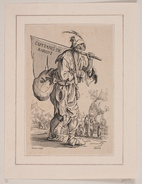 Curator: Here we have Andreas Flinch's "Capitano de Baroni," an etching dating from the 19th century. The work presents a somewhat grotesque, yet fascinating, figure marching forward. What are your immediate impressions? Editor: It feels intentionally crude in its production; there's an interesting focus on line, and I'm curious how Flinch manipulated the etching process to achieve this level of gritty detail. The costuming of the central figure suggests a parody of rank or stature. Curator: Precisely. This piece offers a commentary on power and social hierarchy during its time. The 'Capitano' appears burdened and ridiculous. Consider how gender roles and class distinctions would influence the viewer’s reception of such an image. Does this mockery subvert or reinforce existing stereotypes, and which communities does the character invoke or represent? Editor: And consider the materiality—the physical act of etching requires planning and execution. How did Flinch employ specific tools and techniques to emphasize the character’s degradation? Is the relatively inexpensive medium intended for mass dissemination of this parody and social critique? Curator: The caricature certainly allows Flinch to question the accepted norms and perceived authority figures, but through the figure, what commentary does the artwork evoke regarding the perception of those who fail to live up to its values? Perhaps it questions the performance of power itself. Editor: Yes, that feels right. Flinch used a method meant to be duplicated and distributed widely, suggesting that it was more than just a personal reflection on this kind of absurd authority, or that he wished to generate reflection in others. Curator: Indeed. By placing it within our current social dialogues around equality and accountability, the work creates another opportunity to see if any of these discussions continue today. It creates new insights, doesn’t it? Editor: Absolutely. And looking at the labor involved in etching, printing, and distributing, and that production becomes even more interesting as we consider its intent and possible reception, because labor defines it's own class connotations that the art both adopts and critiques.