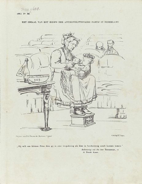 Curator: This drawing, entitled "Spotprent op het ouderwetse kabinet Heemskerk Hasselman, 1867," seems ripe for interpretation. Johan Michaël Schmidt Crans captured this moment with a pen, in 1867, a very dynamic year indeed. Editor: Dynamic is one word. My first impression is…domestic unease. There's a stark contrast in line quality that sets a distinctly uneasy tone. Look at the heaviness around the woman versus the more open lines defining the man. What is your opinion of the image? Curator: Absolutely. The drawing offers an interesting juxtaposition—the 'modern' man in his tailcoat, gesturing impatiently, faces a woman, who I believe to be his wife, guarding an outdated piece of furniture. You can really notice that Schmidt Crans’ employs a somewhat romanticized style here, yet it doesn't diminish its pointed message. Editor: Note how the wardrobe becomes almost another character— its exaggerated baroque ornamentation hints at tradition and perhaps stubbornness? The objects lined up on top… the busts, vases—rigid like guards of the past. Curator: The pen technique further amplifies the satire. Each stroke feels deliberate, etching out social commentary as much as physical form. One might ponder about the artist's intentions in the time in which this artwork was conceived? What could Johan Michaël Schmidt Crans have wanted to communicate with this image? Editor: I suspect Schmidt Crans, through this satirical lens, captures a moment of societal tension, doesn't he? Where progress clashes with the comfort—or the perceived stagnation—of the old ways, quite interesting how objects come to symbolize philosophical differences. Curator: Yes. The work, though rendered with precision and artistic skill, transcends mere illustration. It morphs into a narrative, an unfolding story of values in conflict within the seemingly innocuous setting of a domestic interior. Editor: A narrative indeed, quite eloquently etched into history. For me it is always remarkable when satire is conveyed with simple lines!