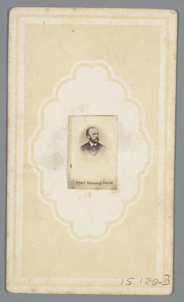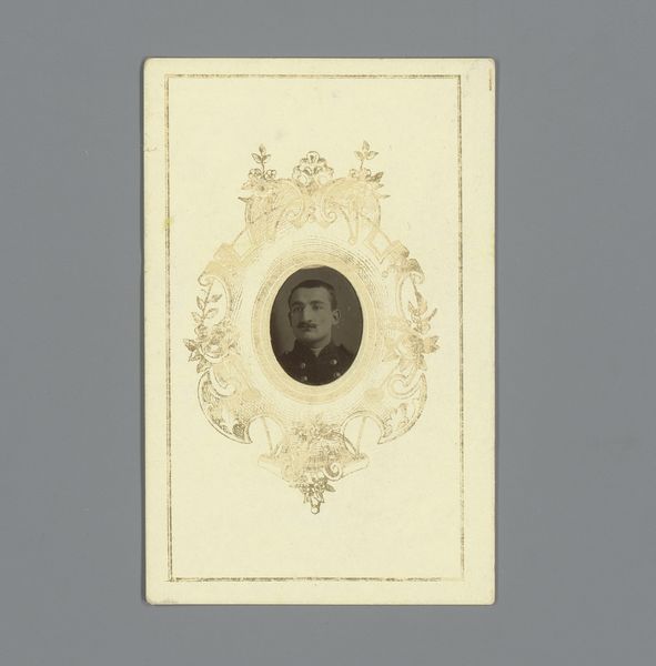 Curator: I’m struck by the stark simplicity of this miniature portrait. Editor: Indeed. This is a photograph titled "Miniatuurportret van een onbekende man," dating back to sometime between 1865 and 1868. It was taken by Frits L.J. Moormans. Curator: The tonal range is fascinating. Notice how the subject’s dark attire contrasts dramatically with the cream-colored paper surrounding the portrait, essentially dissecting positive and negative space. It lends a quiet sense of monumentality, wouldn't you agree? Editor: Yes, but I also find it fascinating to think about these small portraits as status symbols for middle-class families during a transformative moment. As photography democratized portraiture, how did people leverage it for social mobility? How were these portraits displayed and how were they employed to communicate identity? Curator: I agree, the social context is highly relevant here. Yet, the pure arrangement of light and shadow is undeniable in its effect. The carefully considered placement of the man against so much blank space also amplifies a mood of isolation and introspection. The artist truly guides the eye. Editor: Perhaps. Though one might also interpret that emptiness as indicative of photography's early challenge for visibility amidst painting's long held dominance in Western visual culture, forcing practitioners to make novel and experimental choices for portraying their sitters. Curator: True, and either consideration contributes to a broader appreciation for the piece and it's formal or historical meaning. Editor: Absolutely. Looking closely at art is a process. Each perspective enhances understanding.