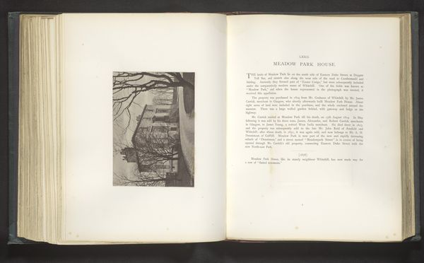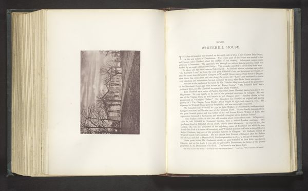 Curator: Thomas Annan's gelatin-silver print, titled "Kelvingrove," predates 1878. It seems to capture not just a landscape, but also a specific structure within that landscape. Editor: There’s something quietly melancholic about this image. The grayscale gives it a sense of timelessness, but also a touch of solemnity, almost like a memory fading at the edges. Curator: The placement of "Kelvingrove" within an open book format affects our perception. We aren’t just looking at the image, we're implicitly asked to engage with it in a dialogue, situating the image within a broader context of publishing practices. Editor: It strikes me that the building appears to be somewhat neoclassical. There's an effort toward order, balance and formality, evident even in a single photographic frame like this one. Do you feel it reflects aspirations of social stature or some idealized view of its cultural place? Curator: The cultural narrative surrounding "Kelvingrove" reflects 19th-century ideals of civic progress, especially the push to catalogue and preserve urban landmarks through photography. Think of its potential influence: documentation became key to constructing an idealised public memory, as photographic records spread across exhibitions and private collections, reinforcing the cultural meaning of place. Editor: I find the bare trees framing the architecture symbolic. The barren branches and dormant foliage set against this very architectural presence make me consider what that positioning could signify, perhaps cycles of growth and decay. Curator: Annan's photographs served the crucial role of not only documenting but legitimizing those civic efforts, using visual language to reinforce Victorian cultural ambitions of order and rational improvement of Glasgow and its landmarks. Editor: I'm leaving with a strong sense of place embedded in a story about representation; it's about far more than simply the document of a building. The image invites viewers to explore the layers between visibility, place, and the stories told and untold.