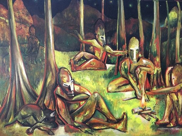 Curator: I'm immediately drawn to the composition—it’s almost like a stage set, isn’t it? The figures arranged so deliberately within this shallow space. Editor: Yes, it possesses a strikingly flattened perspective, which seems to amplify its raw energy, it reminds me of some naive art from a century ago. Curator: Indeed. This is "Donkey Bridge (fragment)" by Niko Pirosmani, an oil-on-canvas work of indeterminable date, a key figure in Georgian primitive art. It shows what seems to be a fragment of a bigger genre scene. Editor: Primitive, yes, but notice how skillfully Pirosmani orchestrates the dark palette and strong contrast between the silhouettes of figures and a busy array of bottles on the shelf. It’s as if the figures, arranged seemingly without perspective, have been arranged for us as viewers, ready for decoding of a message. Curator: It speaks to the culture of feasting, where guests, or Kaduris as they're known in Georgian society, expect excellent dining service, represented by the many bottles the taverner has ready on the wall shelves for a steady wine stream. Editor: Absolutely, this resonates so strongly with archetypes of hospitality and communal festivity across many social settings, wouldn't you agree? Curator: Consider how Pirosmani's focus on this, on public and festive scenes as core for his themes, shaped the popular appreciation of folk tradition that followed him. He’s mythologizing, I’d say. Editor: And within that framework of the feast, Pirosmani finds this tension between an idealized depiction of that collective joy and also a sense of loneliness, if that makes sense. A sense of almost a solemn record-keeping... a time capsule! Curator: In some of his biographies, you can tell that those settings also allude to his own sense of self. Some believe he was homeless and an outcast who sought shelter in feasts and celebrations. This may all be mythology and folklore of course. Editor: These formal elements you noted earlier, such as those rigid arrangements, paired with its almost theatrical character— it grants “Donkey Bridge” its lasting evocative power, it keeps luring interpretations and meanings that would otherwise feel anachronic in most contemporary genre-paintings. Curator: It invites us to remember, beyond our critical frameworks, to always be empathetic about historical understanding of artists.