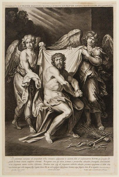 Editor: So, this is Mater Dolorosa with a Dagger in her Bosom by Willem Pietersz. de Leeuw, over at Harvard. It's... intense, right? The raw emotion just leaps out. What strikes you most about this image? Curator: That dagger, piercing her heart... it's not just a physical wound, is it? More like a visual metaphor for the unbearable grief of a mother losing her child. It’s a deeply personal reflection on suffering. The angels almost feel intrusive, don't they? Like sorrow is a private affair, witnessed, but never truly shared. What do you feel about that? Editor: Absolutely. I almost feel like I'm intruding by looking at it. Thanks for that perspective! Curator: My pleasure. Sometimes, the most powerful art is that which makes us feel something deeply uncomfortable.
