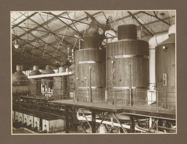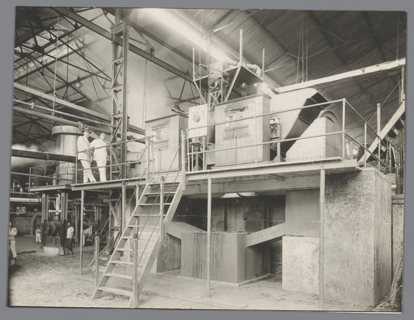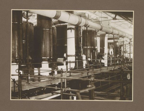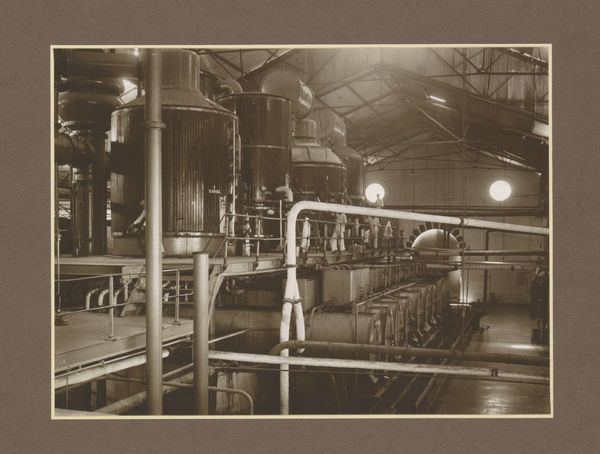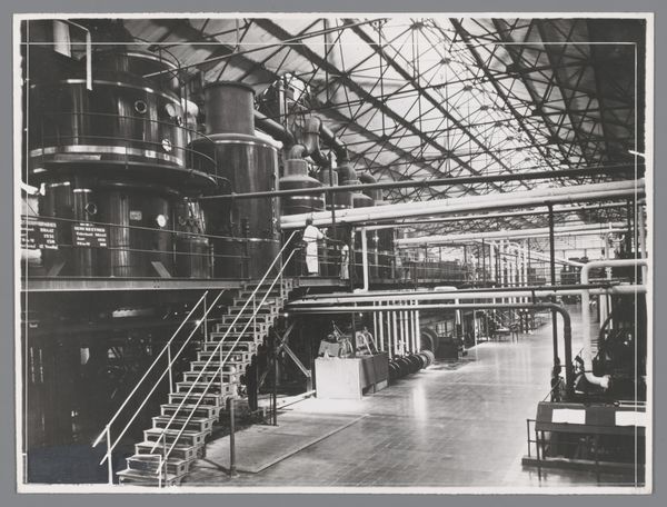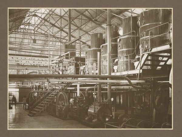 Editor: This photograph, "Hall with machines of sugar factory Goedo te Djombang on Java," taken by Isken sometime between 1925 and 1930, shows a cavernous industrial interior. There's a powerful stillness to it, a sense of dormant potential. How do you read the space captured here? Curator: The image presents a symphony of industrial forms, doesn’t it? More than just showing machinery, it echoes a particular era. What cultural aspirations, do you think, are embedded in this portrayal of industrial progress? Editor: Well, the photograph seems to glorify the modern industrial age. Was that the intention or does it unveil something more about colonial dynamics, maybe? Curator: The colonial context cannot be ignored. Think about the sugar itself. The "sweetness" disguises labor and extraction. The towering machinery, photographed with a sense of awe, also signifies the imposition of industrial processes on the landscape and local populations. Does this visual language remind you of anything? Editor: Now that you mention it, there's a coldness. All the mechanical elements seem very removed from any human interaction. So, is that the colonial project, then – this kind of systematic dehumanization? Curator: Perhaps. Or it points to a mindset: efficiency above all else. But even in that supposed detachment, one can still glimpse the labor that keeps this factory alive. So, in effect, Isken has recorded cultural ambitions and anxieties simultaneously, in that gelatin-silver print. Editor: I hadn't considered how the very act of documenting industry could carry so many layers of meaning! Thank you, I’m going to reflect on this more. Curator: And I on the subtle colonial undertones you drew out, that often remain unnoticed.