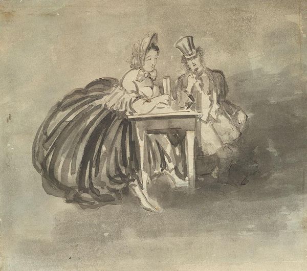 Editor: Here we have Joseph Highmore's "A Couple Seated on a Garden Bench" from the Tate Collections. It's a lovely ink drawing. How would you approach interpreting this piece? Curator: Note how Highmore uses the stark contrast between the hatched lines that define the bench, and the softer, more amorphous washes to depict the figures' clothing. The linearity is interesting. What does it suggest to you? Editor: It seems like a study in textures, almost— the solid, defined bench versus the flowing, less defined figures. Curator: Precisely. Consider how the parallel lines of the bench's structure visually separate the couple, despite their physical proximity. It's a study in pictorial construction and compositional dynamics. Editor: That’s a great observation; I hadn’t considered the bench as a visual barrier before. Curator: Indeed. It reveals the underlying structure shaping our perception.