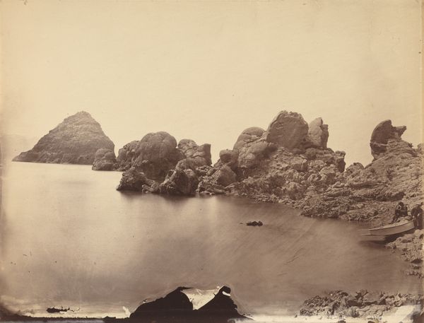 This photograph album page, made by an anonymous artist, presents a study in contrasts and textures. The composition is dominated by the rough, irregular forms of the rocks in the foreground, their surfaces fractured and uneven. The monochromatic palette, a range of sepia tones, enhances the tactile quality of the stone, inviting a sense of touch. In the distance, the smooth, unbroken plane of the water meets the sky in a seamless horizon. A figure, standing on the rocks, provides a human element, a point of scale that accentuates the immensity of the natural landscape. The photograph plays with the concept of the sublime, a philosophical idea that emphasizes the awe and terror induced by nature's vastness. The irregular forms of the rocks and the seemingly endless expanse of the sea evoke a sense of the unknown and the uncontrollable. These visual elements create not just an aesthetic experience, but an exploration of our place within the larger cosmos.