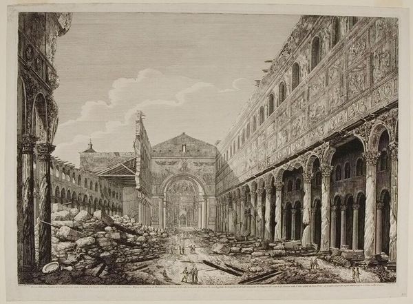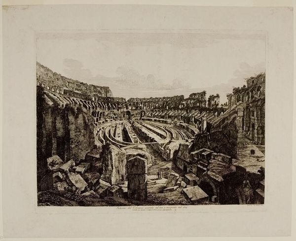 Editor: This is Luigi Rossini's "Walls of Rome," and the level of detail in the etching is really striking. What do you see in terms of its formal qualities? Curator: Observe how Rossini employs contrasting textures, from the smooth stone of the arches to the rough foliage. The composition is carefully structured; the walls dominate the visual field, but the figures and trees introduce a dynamic interplay of line and form. Editor: So, the juxtaposition of architectural rigidity and organic forms creates a sense of depth? Curator: Precisely. The use of light and shadow further accentuates this depth, drawing the eye through the composition. The rhythmic repetition of arches leads to the architectural details in the distance, so tell me what is your reading of these combined elements? Editor: I see now how the strategic use of texture and perspective makes the ruin come to life. Curator: Indeed, a masterful exploration of form and texture.
