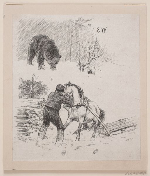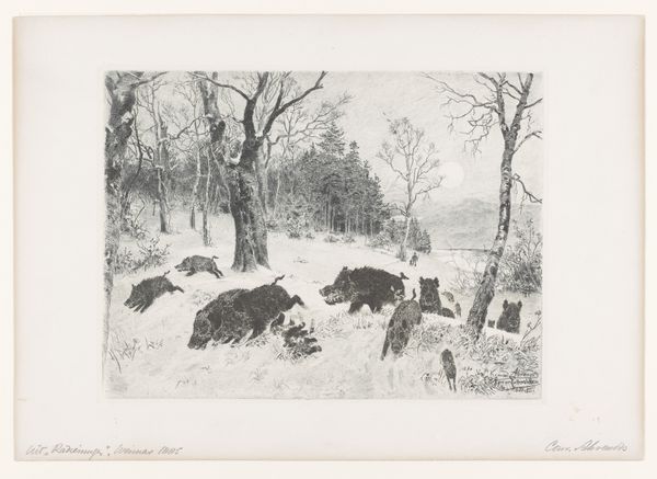 Auguste André Lançon created this etching, titled "Wild Boar in a Forest," using metal plate and acid. The image is created by drawing through an acid-resistant ground to expose the metal, then bathing it in acid, which bites into the lines. Ink is then applied to the plate, and the surface is wiped clean, leaving ink only in the etched grooves, before being printed on paper. This printmaking technique is a highly skilled, labor-intensive process. The artist's hand is evident in the quality of the drawn line, creating a richness of tone, and capturing the texture of the boars’ bristly coats. It sits at an interesting point in the history of reproduction, an accessible medium that sits between high art and industrial production, opening up art to a wider audience. Consider the time, skill, and effort required to produce this image, and the way its physical qualities give it a unique presence and cultural value. By understanding the making process, we can appreciate the artistry and significance of works like this, which challenge traditional distinctions between fine art and craft.