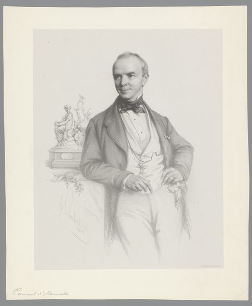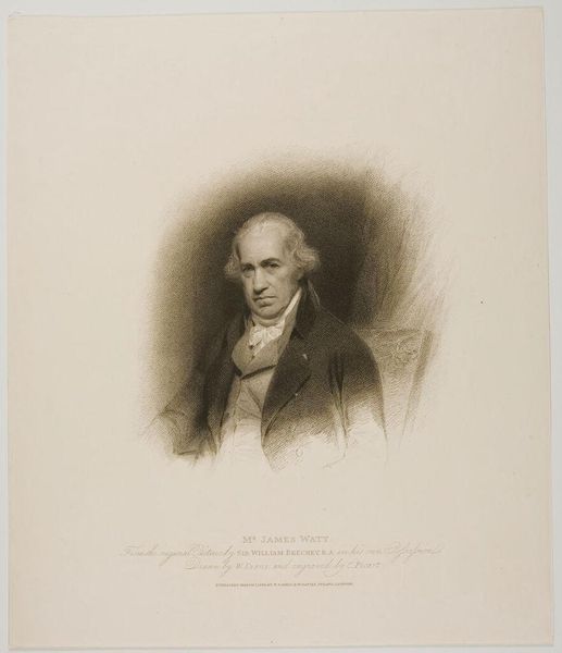 Curator: Here at the SMK, we have this arresting portrait of George Ryan, dating from the mid-19th century, specifically sometime between 1811 and 1879. Editor: He looks intensely serious, doesn't he? I’m immediately struck by how piercing his gaze is. And there's a wonderful contrast between the sharp details of his face and the softer, almost smoky rendering of his clothing. Curator: Exactly! What we're seeing is a combination of printmaking techniques, specifically lithography and engraving, allowing for both those delicate tonal gradations and crisp lines. The artist’s commitment to Realism is also very apparent here. There's no attempt to idealize his features, rather he presents us with an unflinching record of his subject's character. Editor: It's compelling, definitely. I see the composition too as incredibly intentional, that vignetted edge which concentrates all our attention to the face itself. What do we know about Ryan himself? Curator: Unfortunately, precise details about him remain scarce, but we see here a kind of archetypal figure: the austere 19th-century gentleman, caught at that interesting turning point where science and rationalism really begin to challenge more romantic notions of selfhood. Editor: Fascinating, it makes me think of the evolution of photography during this period, and these efforts to accurately document appearance as its own kind of art form. Curator: You've touched upon such a critical intersection there, and I completely agree. There's such an authenticity here—the way the lines capture his aging face and contemplative essence makes us wonder of his full life beyond what we see presented to us. Editor: To look at him—with that unyielding and knowing gaze, you begin to question all your prior ideas and values. Curator: Perhaps this portrait serves as a reflection of a bygone epoch or provides a mirror, urging self-examination? Regardless, this artwork undeniably evokes introspection. Editor: Well, the next time I need a dose of stark realism, I’ll know where to come. Curator: Indeed, this enigmatic man is definitely one to reflect upon.