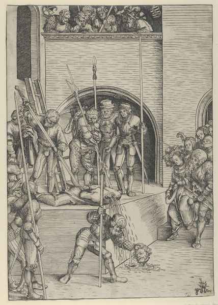 Urs Graf created this woodcut, "The Agony in the Gardens and Christ's Arrest," in the early 16th century. It depicts two scenes from the Passion of Christ, reflecting the religious and social climate of the time. Made in Switzerland, the print reflects a culture grappling with religious reform, social upheaval and rising antisemitism. The imagery can be interpreted as a commentary on contemporary social structures. The flag displays a Crescent and star, which may allude to the association of Jews with the Ottoman Empire, a common trope in antisemitic imagery. The figures of Christ and his followers are rendered with a certain vulnerability, contrasting with the aggression of the arresting soldiers. Graf’s imagery invites reflection on power dynamics and social justice, themes that resonated deeply in the context of the Reformation. As historians, we look to sources such as theological texts, social commentaries, and other artworks to fully understand the complex layers of meaning embedded in Graf's work. The meaning of this piece relies heavily on the context of its time.