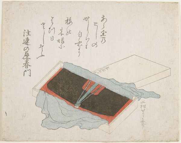 Curator: Isn't there something so peaceful about this print? Like a still life in muted colors, or maybe a snapshot of what 'quiet' looked like in 1816? Editor: "Small Cabinet and Sword Stand" is the title, crafted by Ryūryūkyo Shinsai. What's really striking about it is its encapsulation of the symbolic weight imbued in objects during the Edo period, particularly the katana, the samurai sword. Curator: True. Though, more than the historical context, I’m struck by the textures, like a secret language whispered by the grain of the wood. It feels…hushed. What's your read on it? Editor: My read circles back to power dynamics. Consider the place of samurai in a rigidly stratified society, their swords, status symbols intertwined with militaristic values that demanded absolute allegiance. A work like this presents a distilled moment reflecting class, honor, and societal order. Curator: But could it also be something simpler, a peek into a world where even utilitarian items possess artistry, and maybe the suggestion that even within rigidity, you might stumble upon quiet reflection? I keep imagining Shinsai choosing to preserve *this*, a small selection, not a sweeping battle, just…objects. Editor: Absolutely. The individual and the social are never really separable. Seeing Shinsai, perhaps, making a statement – maybe even an observation that quiet strength often lies dormant. Also, did you notice the print is woodblock, with ink and watercolor? A masterful layering of different modes. Curator: I love it! The blend feels like the moment when strength softens. Is it just me, or do you also feel as though it’s inviting contemplation as much as providing information? Like an echo of the soul in what seems to be merely utilitarian? Editor: Without doubt. By focusing on domestic objects closely connected to male identity and its societal performance, it inadvertently opens itself up to broader conversations about material culture. And of the aesthetics of Japanese art too. Curator: Beautifully put! Editor: A convergence, maybe, of aesthetic simplicity and a deeper reading into historical structures…it lingers in the mind, doesn’t it?