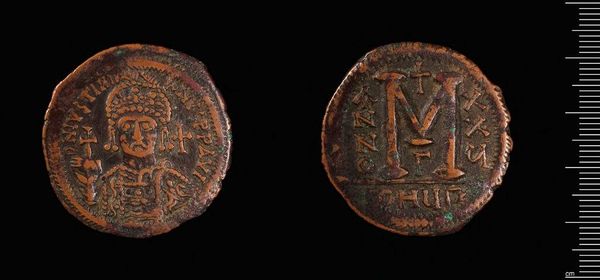 Curator: Here we see a bronze coin, minted during the reign of Justinian I, a weighty piece at nearly 25 grams, currently held at the Harvard Art Museums. Editor: It possesses an almost ghostly quality, doesn't it? The patina of age softens the images, giving it a sense of mystery. Curator: Indeed. Coins like these served not only as currency but also as propaganda, circulating the emperor's image and authority throughout the Byzantine Empire. Editor: The cross above the large "M" on one side would have been a potent symbol, reinforcing Christian belief, while the ruler's portrait conveyed power through its very presence. The iconographic program is quite direct, isn't it? Curator: Absolutely, and the standardization of coin imagery, including the weight and metal content, reflects Justinian's efforts to centralize power and stabilize the empire’s economy. Editor: Gazing at this coin, I imagine countless transactions, each a tiny affirmation of faith and imperial control. It really speaks to the enduring power of symbolic representation. Curator: Yes, and through its very survival, it continues to tell us about the forces that shaped the Byzantine world.
