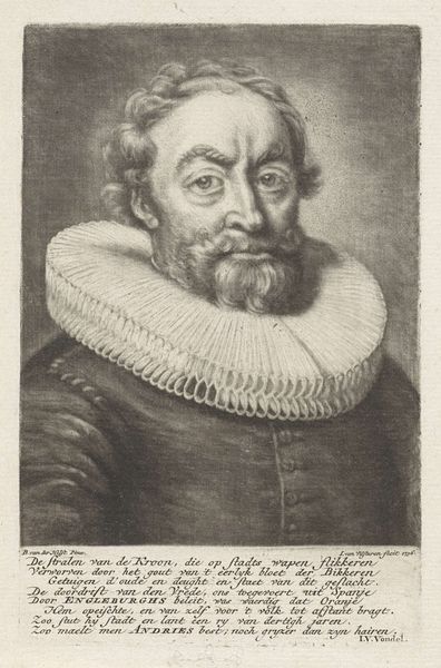 Curator: Standing before us is "Portret van Andries Bicker," an engraving completed between 1861 and 1863 by Jan Frederik Christiaan Reckleben. It’s currently held here at the Rijksmuseum. Editor: It’s quite striking, really. There's a gravity to his gaze, a somber air that the artist captures beautifully with the engraving. The detail, especially in his ruffled collar and facial hair, is extraordinary. Curator: Absolutely. This portrait adheres to the stylistic conventions of 19th-century academic art, heavily influenced by Neoclassicism, as it aimed to revive classical artistic values of earlier eras, evoking ideals of leadership, nobility, and civic duty. We must remember that images such as this helped cement power structures. Editor: Power is definitely the right word. Portraits like these weren't just about capturing a likeness. They served to construct and project authority. Who was Andries Bicker within the larger Dutch social and political structure? Curator: Andries Bicker was an influential Amsterdam merchant and statesman during the Dutch Golden Age. As a member of the Bicker family, he was a leading figure in the city's oligarchy. This print reflects his significant status. His identity and place are underlined further through the inclusion of his family's coat-of-arms displayed prominently beneath his portrait. Editor: Knowing that contextualizes everything. Now, his serious expression feels less about individual personality and more about upholding an image appropriate to his position in Dutch society. The clean, almost severe lines of the engraving certainly add to that sense of formal representation. It underscores the patriarchy and exclusionary power structures that individuals like Andries Bicker benefited from and actively reinforced. Curator: Exactly, and that gets at the core of the political nature of portraiture. This isn't just about representing a person. It's about affirming a certain order, a certain distribution of power. Works like this one speak volumes about how artistic representations reinforce dominant narratives within historical power dynamics. Editor: It provides such insight into the relationship between art, power, and historical context. Curator: It’s true. A valuable image to consider when navigating and exploring social issues in historical art!