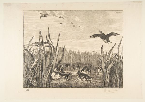 Richard Evett Bishop made this etching, titled 'Up and On', in 1940. What strikes me is the artist’s approach, the way the marks build up to create the illusion of feathers and flight. It’s clear that Bishop understood artmaking as a patient, committed process, slowly building images from simple means. The texture of the piece is fascinating. The lines vary in weight, creating depth and shadow. Look closely and you can see how the individual strokes of the etching tool coalesce to form the ducks and the reeds. It's quite impressive how he captures the dynamism of the ducks' movement with static lines. Notice how each duck seems to have its own character, each captured with subtle differences in the etched marks. This piece reminds me a little of Durer's engravings. Like Durer, Bishop embraces the ambiguities of mark-making. There is no definitive statement being made here, just a fleeting moment captured in lines. It's this openness to interpretation that keeps me coming back to works like this.