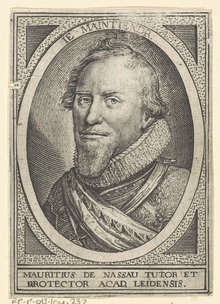 Editor: This is a print titled "Portret van Maurits, prins van Oranje, op 51-jarige leeftijd," dating sometime between 1618 and 1699. It’s an engraving by an anonymous artist, housed in the Rijksmuseum. I'm struck by the formal rigidity and the clear display of power. What sociopolitical narratives do you see playing out in this piece? Curator: That’s a perceptive observation! Think about the Dutch Golden Age. What we're seeing is not just a portrait but a carefully constructed representation of power during a period of significant social and political upheaval. This was a time when the Dutch Republic was fighting for independence from Spain, and images like this were crucial in solidifying national identity and leadership. Editor: So it’s like propaganda, then? A tool to construct an image of authority? Curator: Precisely. Look at the way Maurits is presented: the stern expression, the elaborate ruff, the armour – all these elements contribute to an image of a strong, capable leader. The inscription surrounding the portrait, listing his titles and achievements, further reinforces this. How do you think the context of war and religious conflict influenced the artist’s choices? Editor: I suppose the artist aimed to inspire confidence, to assure the public that Maurits was the right man to lead them. I hadn’t considered the role of art in nation-building in this way. Curator: Absolutely. And remember, the intended audience wasn’t just the elite. Prints were relatively accessible, meaning these ideas were disseminated amongst a wider public. This image participates in and shapes contemporary ideas around power, gender, and national identity. Considering this, does it change your initial perception of formality? Editor: Yes, it does! I was thinking about aesthetic choices, but now I see it as part of a much larger conversation. Thanks, I'm understanding more now about the impact this image had at the time. Curator: My pleasure. It is crucial to keep in mind how intertwined art is within political and social frameworks, providing opportunities for discussions around identity and history.
