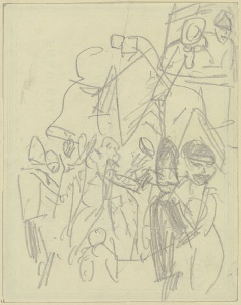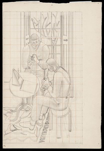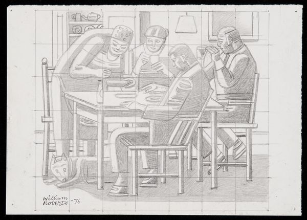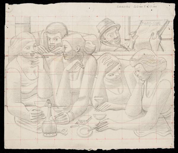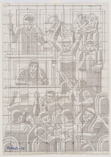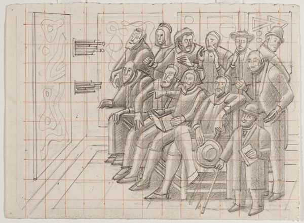 Editor: This is William Roberts' "A Reception at the London Group". The figures feel rigidly geometric, like architectural components, rather than individuals. What structural elements stand out to you? Curator: The work's grid foundation immediately commands attention, dictating the form and placement of each figure. Notice how Roberts uses this grid to both construct and constrain the image. Editor: It's almost like he's building with people as his blocks. Curator: Precisely. The repetition of rounded forms and the near-monochromatic palette further emphasize the compositional structure, shifting the focus from individual expression to formal arrangement. Consider how this impacts our reading of the social interaction depicted. Editor: I see it now; the lack of color flattens the figures, reinforcing the geometric abstraction. Curator: Indeed. The artwork compels us to contemplate the interplay between structure and representation. Editor: This new understanding offers a fresh way to consider the artwork's underlying purpose.