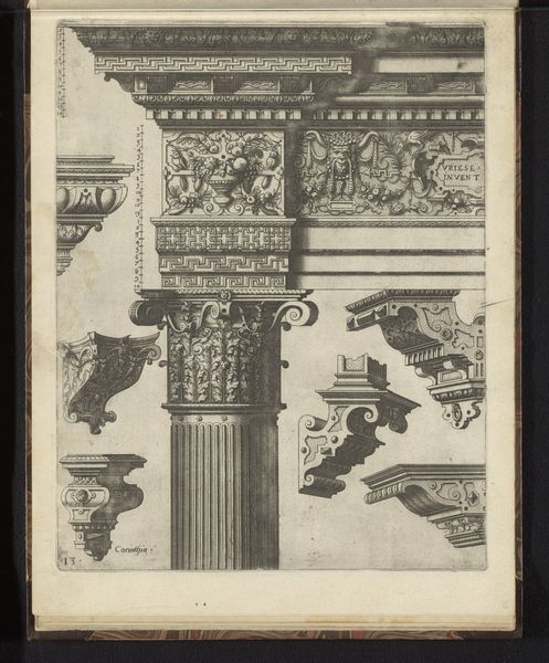 This is a drawing of a Corinthian entablature with rosettes and consoles, by Johannes or Lucas van Doetechum. Note the acanthus leaves that adorn the capital, symbols of resilience and rebirth found in ancient Greek and Roman art, evoking themes of growth and prosperity. Observe also the repeated use of the rosette motif: a stylized flower, it signifies beauty, secrecy, and the unfolding of potential. These elements are not confined to classical antiquity alone. The rosette, for instance, reappears in medieval rose windows, and Renaissance tapestries. As these symbols migrated across time, their meanings became enriched, accumulating layers of cultural significance. One can also see that the faces and masks that are added to the consoles act as guardians of the sacred space. These images, and their emotional, psychological, and cultural effect, engage us with a profound sense of continuity, bridging past and present.