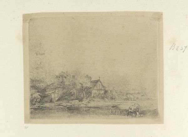 Editor: This is Rodolphe Bresdin's "The House with the Curved Façade, from Revue Fantaisiste," created in 1861, using etching on paper. It’s a detailed, almost dreamlike landscape. What do you see in this piece, beyond the surface? Curator: This image vibrates with social tension. Consider the "Revue Fantaisiste," a journal emerging in a Paris grappling with rapid industrialization and social upheaval. Bresdin, a staunch republican, situates this seemingly pastoral scene within that context. Does this feel like an idealized countryside or something else? Editor: It feels more… contained, maybe? Almost claustrophobic with all the detail. Curator: Exactly! The dense foliage, the way the house seems to loom—it hints at the pressures on rural communities. He’s not simply depicting a landscape; he’s reflecting a struggle against encroaching urbanization. Notice the figures tending the livestock. Who benefits from their labor? Editor: I hadn't thought about it that way, seeing the work in light of the political commentary. The "curved façade" now seems like a symbol of a community being bent and reshaped. Curator: And what about that bird flying away in the distance? Is that a hopeful signal of escaping or a sense of alienation from the land? Considering how this artist used the detailed, realist style for what’s overall Romantic landscape speaks volumes of what’s left unspoken, or in the shadows. Editor: So, looking at Bresdin's work isn't just appreciating a pretty picture, it's questioning the narrative behind it. Curator: Precisely. Art serves as a document, a critique, and a catalyst for deeper social understanding. I will keep an eye for more context in realist landscapes!