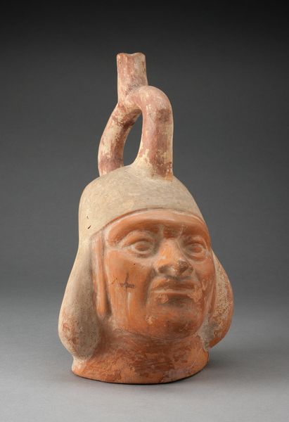 This is a portrait vessel with a feline headdress, made by the Moche people, crafted from earthenware. The Moche flourished on the northern coast of Peru from about 200 to 850 AD. Here we have an object that is both functional and deeply symbolic. These vessels were not merely utilitarian; they were integral to Moche life, reflecting social structures and spiritual beliefs. The feline headdress, though now missing its focal point, hints at the power and prestige associated with feline imagery in Moche culture. Felines were often linked to rulers and warriors, embodying strength and control. The individualized features on the portrait suggest this may be the likeness of an elite member of Moche society. The stirrup spout is a typical Moche design, yet it adds an element of dynamic tension to the otherwise serene face. Consider how the Moche used portraiture not just to represent individuals, but to embed them within a broader cultural narrative. This vessel offers insights into a society where identity, status, and symbolism were inextricably linked.