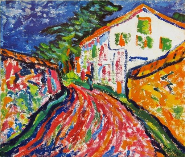 Curator: Looking at Kirchner's "Fehmarn Houses" from 1908, I'm immediately struck by how turbulent yet strangely comforting it feels. It's like a cozy nightmare. Editor: Cozy nightmare, I love that! To me, it feels almost carnivalesque, but with a slightly menacing undertone. Kirchner's thick application of oil-paint really makes those cottages in Fehmarn practically vibrate, wouldn’t you agree? Curator: Absolutely, the materiality itself feels radical. Now, "Fehmarn Houses" occupies an interesting space within the historical narrative of Expressionism and even brushes against Fauvism. Painted during Kirchner's pre-Die Brücke period, one can trace its lineage back to Van Gogh's emotionally charged landscapes while recognizing the genesis of what will become the group's signature style. It reflects not only the formal innovations but also anxieties of pre-war Germany. Editor: Anxieties, definitely, though there’s a naivete, too. See how those buildings sort of huddle together? And that massive tree on the right, almost guarding the village? It's like he’s both celebrating the simple life and warning against some impending doom – painting what he feels more than what he sees, I bet! That blue… it is almost an after-image. Curator: It speaks to a conflicted national identity too, grappling with rapid modernization. The return to landscapes can be seen as a utopian impulse, an escape, while those distorted forms also mirror a societal unease percolating beneath the surface of bourgeois comfort. His choices, therefore, resonate with socio-political resistance in its own manner. Editor: I wonder if anyone on Fehmarn Island felt Kirchner was capturing *their* truth back then, or if they thought, “Who’s this crazy painter making our homes look like they’re about to melt?” The magic of art, though, is that he has preserved that reality as seen through his eyes. Curator: Yes, this particular moment through his singular lens offers so many avenues into understanding Kirchner's oeuvre and the cultural dynamics of the period. I'm especially taken by how he reclaims the rural setting, offering a very nuanced comment on tradition versus progress. Editor: And for me, it's that lingering feeling—like I’ve stepped into a place both familiar and alien, a world on the verge of some significant… change. Thank you, Kirchner, for keeping us on our toes a century later!