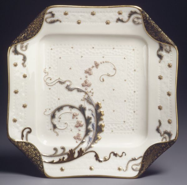 This frame was created by the United States Pottery Company. It is a fascinating object whose edges undulate in a rhythmic pattern, punctuated by stylized acanthus leaves. This motif, echoing classical ornamentation, hearkens back to ancient Greece, where the acanthus leaf symbolized enduring life and rebirth. It's a decorative element that has journeyed through time, adorning Roman temples, Renaissance paintings, and now, this American frame. Consider how this symbol has been passed down through history, shifting in meaning yet retaining its connection to classical ideals. The acanthus leaf, in its persistence, speaks to the enduring human desire for beauty and order. This frame invites us to reflect on how motifs evolve, resurface, and take on new meanings in different historical contexts.