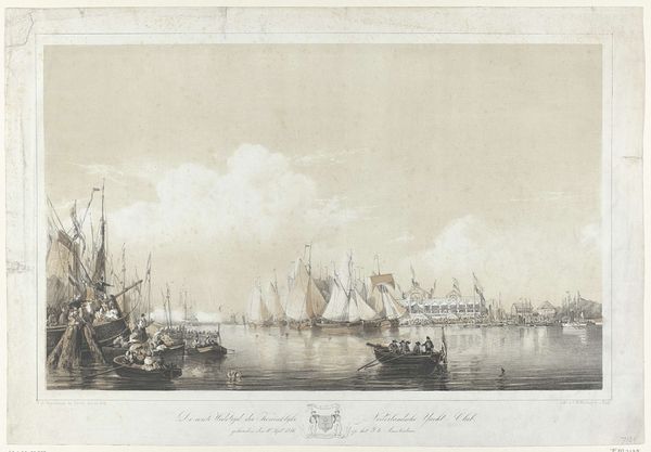 Curator: This lithograph from 1855, created by Adolf Carel Nunnink, captures a specific moment: a view of the Festival Building in Rotterdam. Note how the cityscape dominates, a testament to 19th-century urban development. Editor: It's rather muted, isn't it? The grayscale gives it a somewhat somber feel, even though it depicts a festive occasion. I'm immediately struck by the stillness of the water, contrasting with the implied energy of the event. Curator: Well, lithography lends itself to this subtle gradation. Consider the stone Nunnink would have used, carefully layering the image through successive applications of ink and pressure. This technique allowed for a wide distribution of images documenting such civic structures. It speaks to the industrial capacity and a growing need to disseminate information visually in the burgeoning urban landscape. Editor: I see what you mean, but still…that single flag atop the large hall on the left... it droops slightly, and the people seem so small compared to the architecture. Is there perhaps a comment on the individual's place within this new, industrializing society? Or is that merely my interpretation imposing on the scene? I'm intrigued by that. The tall ships also appear less grand here, their symbolic power somewhat diminished. Curator: Possibly. But let's not ignore the socio-economic implications of the print itself. The rising middle class sought access to visual representations of progress. These prints became commodities, and thus participated in the cycle of production and consumption emblematic of the time. Lithography made art more accessible and allowed for documentation of contemporary advancements. Editor: That is all true. Thinking about it, flags and tall ships evoke a sense of mercantile pride and global ambition that certainly permeated the 19th century and can also be perceived from the point of view of power relations and commerce reflected in the materials, and now echoed faintly by these symbols. It also feels relevant that the "Feestgebouw" would hold music. Curator: Precisely! The lithograph acts not just as an artwork, but as evidence of cultural and material production of mid-19th century Rotterdam, depicting a structure for communal artistic gatherings, and an artistic method of production and dissemination. Editor: Food for thought indeed! Seeing Rotterdam through Nunnink's grayscale perspective encourages reflection about this historical moment. Curator: Yes, and viewing it as a product of 19th century artistic dissemination as well.