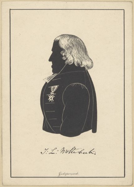 Editor: This is a silhouette portrait of Charles Guillaume Merkus, crafted between 1809 and 1848 by Pieter Barbiers IV. It's rendered in ink, creating this striking black-on-white image. It feels both elegant and slightly severe. What stands out to you about this piece? Curator: What strikes me is how this seemingly simple silhouette speaks volumes about the evolving role of portraiture and societal hierarchies of the era. Consider how photography was still in its infancy during much of this time. Silhouette portraits like this provided a relatively accessible way for the middle class to participate in image-making and memorialization, something previously reserved for the elite. The starkness of the image, the focus on the external presentation through clothing and adornment... What might that suggest about how identity was being constructed and consumed in the 19th century? Editor: So it's more than just a likeness; it's about participation in a changing social landscape? And you're saying the clothing, like his elaborate collar and the medal, speaks to identity? Curator: Precisely. What can we deduce about Merkus's status and aspirations from these carefully rendered details? Was the artist making a straightforward representation, or is there an element of social commentary embedded within this popular format? Think about the institutions this man likely belonged to, the kind of public role this portrait might have played in affirming his place in that society. Editor: That's fascinating; I hadn't considered the public dimension so explicitly. I was just seeing it as a private keepsake. Curator: That’s the power of looking beyond the immediate image and thinking about the context of its creation and consumption. We need to analyze the impact art has on culture to completely grasp it. Editor: Absolutely. This really highlights how even a simple silhouette can reveal so much about social history. Thanks!