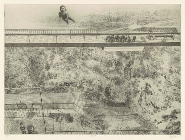 Mina Pulsifer's "Still Night" presents us with a seemingly ordinary scene rendered in stark black and white. It's a night scene dominated by utility poles, a street lamp, and the flat rooftops of what could be urban apartments. Pulsifer, born at the turn of the 20th century, lived through a period of rapid technological and social change. The presence of the utility pole and the rooftop antennae highlight the increasing presence of technology in everyday life. But what does it mean to frame this technological progress with the quiet stillness of the night? Is it a celebration of modernity, or a meditation on its impact on our sense of peace and quiet? Understanding the social conditions that shape artistic production requires us to engage with sources from the period. With further research, we might start to unpack some of the complexities of this print.