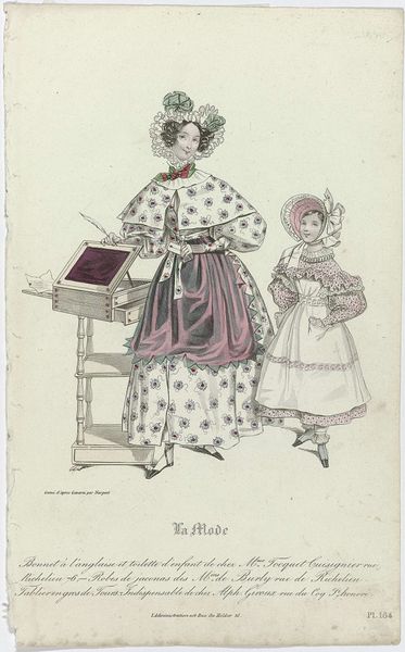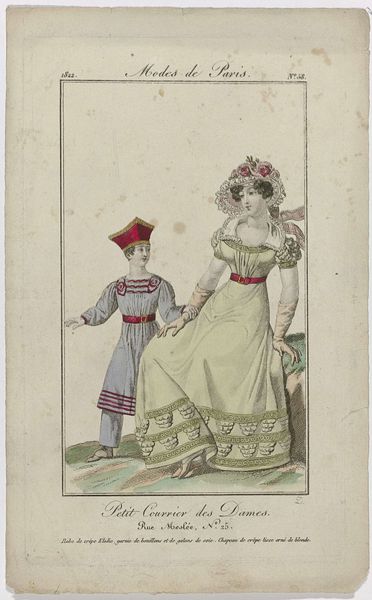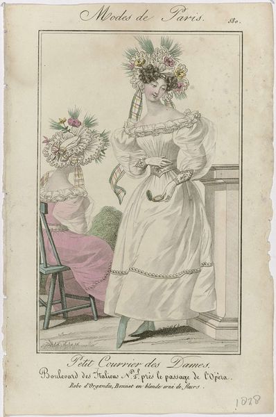 This hand-colored engraving, titled 'Petit Courrier des Dames,' was made in Paris in 1828. It was intended for publication in a fashion magazine catering to affluent women. The print depicts two figures modeling the latest styles. But beyond simply showcasing clothing, it offers a glimpse into the social rituals of early 19th-century Parisian society. We can see the emphasis on refined appearance, a marker of social status. The detailed description of the garments and the inclusion of specific shop addresses also indicate the burgeoning fashion industry and the rise of consumer culture. The title suggests a discreet 'little messenger' delivering the news of the latest fashions to women. To fully understand its meaning, we need to delve into the fashion press of the period, examining who was producing it and for what purpose. What role did fashion play in shaping gender roles and class distinctions? Only through such investigations can we truly understand the place of this artwork in the culture of its time.