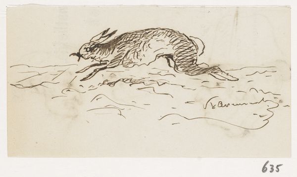 Editor: Here we have Johannes Tavenraat's "Haas," created in 1869. It's a pen and ink drawing on paper, currently held at the Rijksmuseum. It has a raw, immediate quality. What strikes me most is the energy of the rabbit, almost frantic. What do you see in this piece? Curator: The frantic energy you're picking up on is fascinating. Think about the context of 1869. Darwin's "On the Origin of Species" had been published just a decade earlier. How might evolving ideas about the natural world – the animal, survival, instinct – seep into artistic consciousness? Do you see any influence here? Editor: That's an interesting connection. Maybe the quick, almost frantic lines of the drawing reflect a sense of nature as a struggle, a constant flight? Curator: Precisely! And beyond the biological, consider the social implications. Land enclosure movements were displacing people and disrupting rural life, further blurring boundaries between humans and animals. Does the artist’s portrayal hint at themes of dispossession and vulnerability? Is there a story embedded in the quick movements, the animal and the stark, windswept environment in the background? Editor: I hadn't considered that. It does feel like more than just a study of a rabbit. The landscape has this feeling of erasure with these marks. It’s also as if it were running *from* something, beyond our sight. Curator: The ambiguity is potent. It allows us to see in the creature reflections of contemporary social anxieties. It isn’t just an animal portrait. Editor: So, by situating the artwork in its historical context, we reveal those layers of meaning, giving greater insight into Tavenraat's anxieties and observations of 19th-century society. Curator: Absolutely. Understanding that artistic decisions are never made in a vacuum invites us to examine its reflections on socio-political currents of its time. I wonder what its view of our modern world would be.