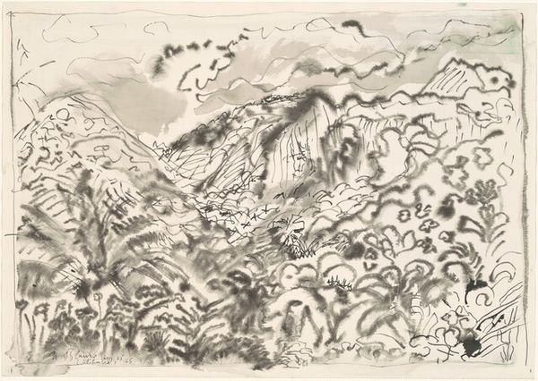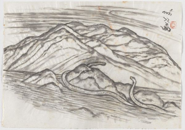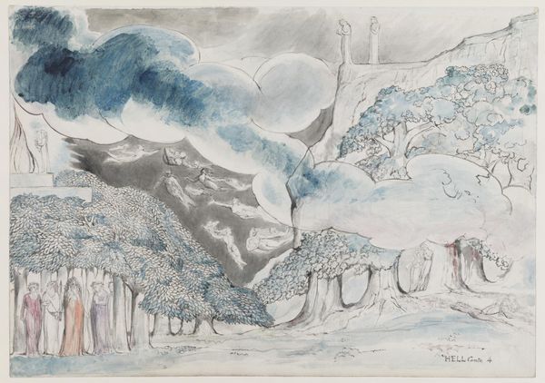 Editor: This ethereal watercolor by William Blake, titled "The Circle of Gluttons," pulls me right in. It's unsettling, with those figures flailing in the water beneath what looks like a crumbling, cavernous landscape. What sort of vision do you think Blake was trying to conjure here? Curator: Blake, bless his visionary heart, always danced on the edge of worlds seen and unseen. Look at the swirling chaos, yes, but also the contrasting light emanating from that archway. It's not just about gluttony; it's about the struggle for redemption, isn't it? That striving for something beyond the mire. Doesn’t it remind you of our own daily battles? Editor: I suppose so, that search for light... Curator: Exactly. And what do you make of the verso? The soaring figure? Is it Enoch ascending, or Blake himself yearning for transcendence? Perhaps it’s both. Editor: That’s a perspective shift I really needed to hear. Thanks! Curator: Art does that, doesn't it? A gentle nudge, a new lens.