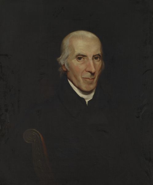 Curator: Here we have "Portrait of Heinrich Gottfried Theodor Crone, Founder of the H.G.Th. Crone Company in Amsterdam," attributed to Jan Philip Simon and created sometime between 1810 and 1838. Editor: The man's severe gaze is rather striking; there's an undeniable sense of formality, almost severity, emanating from the canvas. The contrast between the dark coat and lighter face amplifies that stern quality. Curator: The artist utilizes a classical realism here, prioritizing accurate representation and the meticulous depiction of detail, note especially how light models the sitter's face and high collar. The neutral backdrop concentrates the viewer’s attention solely on Crone. Editor: Beyond the aesthetic, it's compelling to consider Crone within the context of early 19th-century Amsterdam. Here is an emblem of the burgeoning merchant class that came to dominate social and political spheres—an example of a very new kind of leader. Curator: Note, too, the precision in Simon’s brushwork and the limited palette, which suggests a pragmatic and straightforward character. The composition itself is rigorously balanced; it is a work made to embody control and decorum. Editor: But control for whom, and at what cost? It's crucial to acknowledge that economic power in this era was intertwined with systems of labor and resource extraction that impacted marginalized communities, often exploiting them. It asks whose history is being monumentalized here. Curator: I find value in appreciating how this portrait exemplifies early 19th-century realist portraiture—its mastery of technique and precise attention to rendering form, irrespective of modern-day ideological concerns. Editor: For me, the piece acts as a starting point for understanding how the figure's power, however understated visually, depended on broader social structures that should also be made visible through critique and acknowledgement.