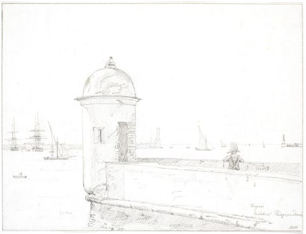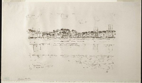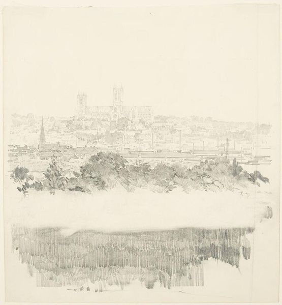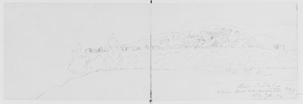 Curator: John William Casilear’s “Waterworks in Haslan (from Sketchbook)” drawn between 1834 and 1838. It's a humble ink and graphite sketch currently residing here at the Met. Editor: Humble is right! It looks like a whispered secret of a town. So faint and delicate, almost as if the paper could exhale, and the image would simply float away. Curator: That ephemeral quality speaks to its creation within a sketchbook. Casilear was capturing a transient moment, perhaps for a larger studio work later on, adhering to the Romanticism of the period by focusing on the beauty of nature and simple architectural scenes. Editor: You know, the interesting thing is how these lines, barely there, can still suggest such solid structures. A church tower, a blocky building... It's the power of suggestion at play. I'm always drawn to pieces that don't give it all away. Curator: And that openness invites the viewer in. Look how Casilear employs a seemingly simple line style to delineate space and volume. There's an inherent sense of depth despite the economy of detail. He’s very careful to consider the negative space, allowing it to describe forms just as clearly as the ink does. Editor: Right, the negative space becomes almost architectural in its own right! Makes you consider what isn't depicted, too. What's the story here? Who inhabits these buildings? What are they doing? The ambiguity turns me into a bit of a detective, or a novelist crafting backstories, I suppose! Curator: He does offer us these hushed and gentle, nearly empty spaces in order to evoke this type of curiosity and contemplation, and these scenes of pastoral charm catered to a rising merchant class eager to establish its cultural legitimacy through the appreciation and patronage of landscapes like these. The Romantics weren't just drawing pretty pictures; they were also helping to create a specific cultural identity. Editor: Well, color me charmed, but also quietly contemplative. I could get lost in the lightness of touch and still come away wondering what secrets this little village holds, even after all this time. Curator: Exactly. A deceptively simple piece holding profound reflections on art, identity, and society during its era. A wonderful conversation starter, isn't it?