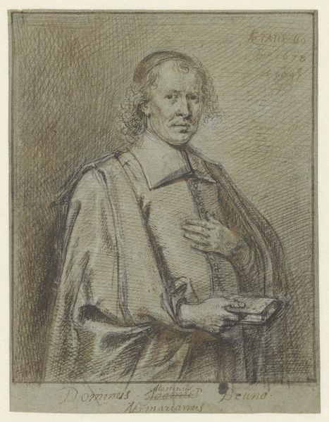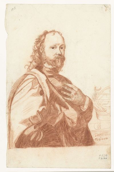 Curator: This is a portrait of Cornelis de Vos, dating back to the 16th century. The work, rendered in graphite, pencil, and other drawing media, can be found right here at the Metropolitan Museum of Art. Editor: It's fascinating! The shading creates a sort of somber mood. I'm particularly drawn to the contrast in textures. Curator: Absolutely. And consider that de Vos lived during a tumultuous period marked by the Dutch Revolt and religious conflict. Portraiture served to consolidate identity and status within complex political landscapes. The slight details, like his buttoned shirt and draped coat, broadcast a very certain socio-economic positioning. Editor: Agreed. The careful lines forming his expression reveal both composure and a hint of something more subdued. The artist masterfully uses light and shadow, with the upper part of the sketch almost faded into the white while other features—his hands, particularly—pop into sharp focus. What are your thoughts about that hand placement? Curator: Good observation! The hands tell us so much about class and self-awareness at the time. Notice how carefully he holds the fabric, but without pretension. Editor: Yes, that connects with your broader point about his identity! The Northern Renaissance placed so much importance on naturalism, and it's on display here in the delicate rendering of form—we can nearly see the folds in his clothing and texture of his hair. I am curious how the original function of this drawing impacted its look; was it meant to be reproduced as a print? Curator: Well, there is no consensus. However, de Vos’ role as a leading painter of his era makes it all the more crucial to consider this print not just as aesthetic practice but also as a marker of artistic success. Editor: I’m intrigued by how an approach rooted in visual form complements a wider frame on gender, race, and status. It is almost as if by visually analyzing the drawing we uncover the politics inherent in representation. Curator: Precisely! By delving into the social position and life circumstances of Cornelis de Vos, as well as acknowledging the artistry involved, we create an image not simply frozen in history, but vibrant in intersectional relevance. Editor: Indeed, it makes me further appreciate how understanding visual composition can lead to even more insights. Thank you. Curator: A most valuable point, and I'm glad we’ve shared a moment to engage deeply with it.