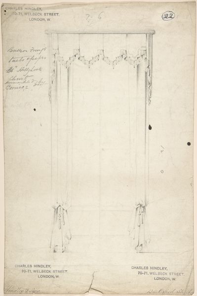 Editor: So this drawing, "Design for Curtains," likely from between 1841 and 1884, attributed to Charles Hindley and Sons...it’s a pencil drawing that feels both precise and whimsical. What catches your eye in this design? Curator: It's fascinating how such a simple sketch can speak volumes about the aspirations of a society. Curtains, seemingly mundane, are laden with meaning. Do you notice how they frame the window, almost like a proscenium arch? Editor: Yes, like a stage. Curator: Exactly. It suggests a desire to present a carefully curated view of the world, both inside and outside the home. Consider the geometric design in the window frame, the meticulous rendering of the fabric, and the ornamental flourishes. These aren’t merely functional elements; they're statements of status, taste, and perhaps even a yearning for theatricality in everyday life. Editor: The tassels and swags do feel quite theatrical. Was this common in interior design at the time? Curator: This level of detail would likely have been reserved for more affluent homes. The design reflects an era of ornamentation, drawing upon historical styles while also embracing new technologies in textile production. Look at how the light seems to play across the imagined fabric – that speaks to a keen awareness of visual effect and a desire to create a sense of luxury and comfort. Editor: It makes me wonder what view these curtains were meant to frame. Curator: An excellent question. Perhaps a manicured garden, a bustling city street, or even a symbolic landscape representing power and prosperity. The curtains don’t just dress the window; they mediate our relationship to the world beyond. The image contains much history! Editor: I never thought curtains could be so symbolic. Thanks for opening my eyes to their potential meaning. Curator: And thank you for seeing the stage behind the design.