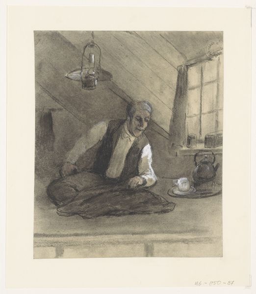 Herman Heijenbrock created this drawing, "Oranjeboven," using chalk and graphite. The artwork presents an intimate domestic scene rendered in muted tones. The composition centers on a woman seated with a baby in a basket, holding a flag. Notice how the artist uses contrasting light and shadow to direct our eyes, drawing us into the interior space. The gentle curves of the figures and objects soften the scene. Heijenbrock destabilizes traditional notions of patriotic art by situating it within a private, familial context. The text on the flag, along with the interior setting, acts as a signifier that reflects broader cultural codes, and this invites us to explore the relationship between personal identity and national pride. The formal structure—its use of line, light, and shadow—functions not merely aesthetically but as part of a larger discourse on nationalism and domesticity, reminding us that art is a site of ongoing interpretation.