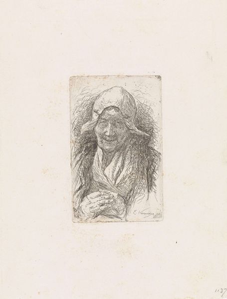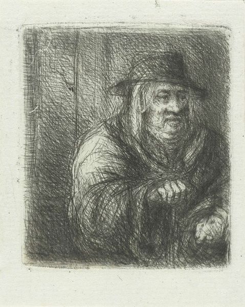 Jan Chalon created this etching of an old man with a cloak and hat in the late 18th century, a period marked by significant social and political upheaval. Chalon, working within the traditions of Dutch Golden Age painting, captures a sense of quiet dignity in his subject. In this small, yet potent image, the old man’s identity is complex. His worn cloak and simple hat suggest a life of hardship, yet his eyes convey wisdom and resilience. The etching technique, with its fine lines and tonal variations, adds depth and texture, highlighting the man’s weathered face and the folds of his garments. This contrasts with the idealized portrayals often seen in art of the wealthy. The artwork prompts reflections on aging, poverty, and the value of human experience beyond material wealth. Chalon’s decision to focus on an ordinary man is a subtle comment on the era’s societal values. The emotional resonance of this piece lies in its capacity to invite viewers to contemplate the lives and stories of those often marginalized.