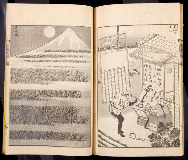Editor: This is a page from Hokusai's *One Hundred Views of Mount Fuji*, published as a woodblock printed book. The stark monochromatic imagery feels very modern. What stands out to you about the means of production of this artwork? Curator: The woodblock printing process itself is crucial. Consider the labor involved: the carving, the inking, the pressing. It democratized image production, moving away from singular artworks and towards mass consumption. How does that shift our understanding of art's value and accessibility? Editor: That's fascinating. I hadn't considered the social implications of the printing process itself. Thanks for pointing that out. Curator: My pleasure. It’s about acknowledging the materiality and the hands that shaped it.