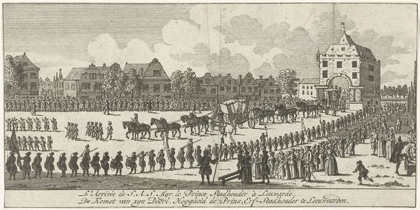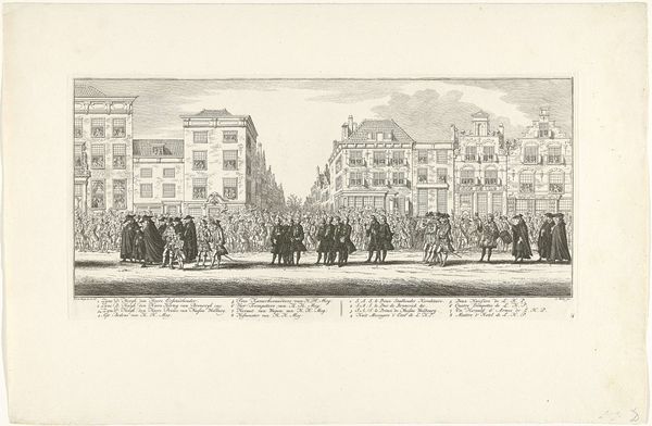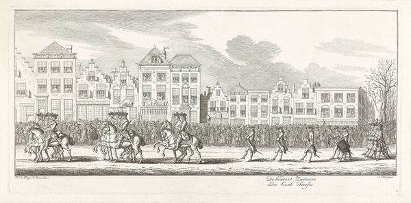 Curator: This detailed engraving by Israel Silvestre, created around 1662, depicts a military parade in remarkable detail. Editor: My first thought is about the meticulous precision here; it’s striking how a scene filled with so much movement still feels almost static. It also brings up complex questions about power. Curator: Absolutely. Silvestre, known for his cityscapes and architectural prints, offers us a glimpse into the pomp and circumstance surrounding 17th-century military displays. Consider the function of this artwork. It's not merely documentation, but a carefully constructed image intended to project power. Editor: I agree. And I wonder how much the 'everyday' people of the time actually bought into this projection? This highly formal spectacle highlights an interesting juxtaposition: the implied authority of the army against the potential resistance, even in its silence, of the gathered crowd. The buildings feel like mere stage props amplifying this performance. Curator: Yes, these meticulously rendered buildings are not passive backdrops. The architecture emphasizes the established order, framing the military parade as integral to civic life. It reminds us that urban spaces have historically been, and continue to be, stages for displays of power. Silvestre was also commissioned by powerful people. Editor: That perspective sharpens my unease. Considering how often marginalised communities bear the brunt of militarisation, and the cost this imposes, I wonder about the ethics of immortalising this scene, especially given how printmaking disseminates ideology far and wide. Are we celebrating an imposition of control, then? Curator: Well, perhaps understanding that potential criticism allows us to reassess the impact of art today. The power of such historical imprints rests in deciphering its cultural framework. The artist doesn't necessarily validate a message, but reflects it. This representation permits examination of France's militaristic strategies. Editor: That distinction is crucial. Reflecting on Silvestre's choices – what he includes, what he excludes – shows us how these spectacles were carefully orchestrated for particular social and political impacts. Thanks to your insights, I understand its cultural power differently. Curator: It's equally important to see how such powerful visual representations inform today’s dynamics. Military parades, architectural choices, and artistic narratives all play roles in establishing dominance and encouraging uniformity.