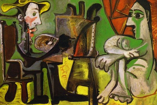 Pablo Picasso made this painting of a painter and his model, in oil on canvas. The colours are giving me a kind of earthy feel, with greens, browns, and yellows, like looking at a landscape through sunglasses. I love how the paint is laid on so thickly, you can practically feel the brushstrokes. Look at the way Picasso builds up the forms with these layers of paint, creating a real sense of depth and texture. He wasn't trying to hide the process; he was embracing it. I'm drawn to the way he renders the artist's face, especially that thick impasto of greens and whites in the beard. It's almost sculptural, like Picasso is carving out the form with paint. For me, this piece has echoes of Matisse, in the bold use of colour and simplified forms. But Picasso brings his own chaotic energy. Ultimately, this painting reminds us that art is always a conversation.