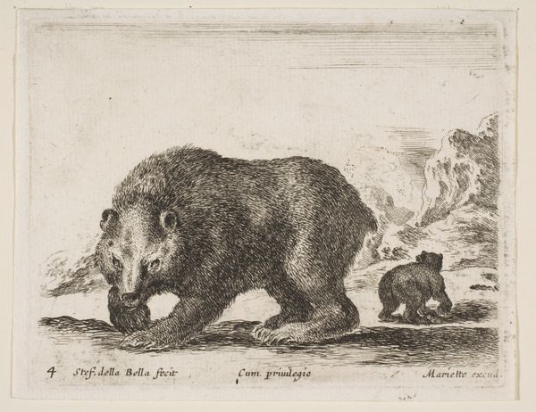 This small engraving of a bear was made by Antonio Tempesta, sometime between 1570 and 1630. During this time, Europe was undergoing a period of intense exploration and colonization. This image reflects a growing interest in the natural world, fueled by voyages to new lands and the desire to document and classify different species. Bears, as powerful and potentially dangerous creatures, often symbolize strength, courage, and the untamed aspects of nature. Tempesta's detailed rendering of the bear, set against a mountainous landscape, emphasizes these qualities. However, it's important to consider the cultural context: bears were also hunted and used in entertainment, such as bear-baiting. This raises questions about our relationship with the natural world and the power dynamics inherent in representation. Does this image evoke a sense of awe and respect for the animal, or does it reflect a desire to dominate and control nature?