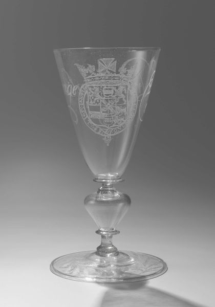 Editor: This is a Communion cup, made of silver by Ralph Leeke around 1683-1684. It’s currently housed at the Metropolitan Museum of Art. It feels very austere to me; the simple shape and reflective surface seem to highlight its functionality, but what strikes you first when you look at it? Curator: The immediate appeal resides in the play of light across its surface, doesn’t it? The cool gleam of the silver is subtly modulated by the form. Note the elegant simplicity of the cup's silhouette. The conical bowl transitions smoothly into the stem, which, in turn, flows gracefully into the circular base. How do you read the proportional relationships between those segments? Editor: I guess I hadn't really considered that. The base is solid, and seems to counter the delicacy of the bowl on top. Curator: Precisely. This tension contributes significantly to the overall aesthetic impact. Observe how the artist has employed a restricted vocabulary of forms – circles, cones, and cylinders – to create an object of restrained elegance. Do you find the inscription disrupts or reinforces this design principle? Editor: I'm not sure… It seems… separate, like an add-on? Curator: Exactly, the application of the engraving breaks the overall symmetry and asks us to decode meaning from that disjunction. A key element of formalist theory lies in determining meaning based purely on an artwork’s visual properties, therefore we can examine the tension brought up in its deviation. Editor: That's interesting. So even a simple cup can hold a complex dialogue of form and meaning! I hadn’t thought about it in those terms before. Curator: Indeed. Every element, from the curve of the bowl to the placement of the inscription, contributes to the cup's formal statement. We can discern significant meaning without considering outside factors.