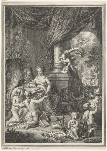 Hendrik Post made this allegorical print with etching, a printmaking technique that relies on skilled handling of acid and metal. It dates to around the 18th century. The etched lines create a scene of classical and symbolic figures. But look closer – what's striking is how this image promotes trade and global reach. Mercury, the god of commerce, sits above personifications of Africa, America, Asia, and Europe, their postures suggesting resources and submission. An etching depicts a global perspective through labor and materials. Consider the skills needed to produce this print, which would have required physical effort and specific know-how. It reflects the growing importance of mercantile exchange during this era, along with the unequal power dynamics of colonial expansion. Here we see how a single print involves intricate making processes that connect to a much broader social context.