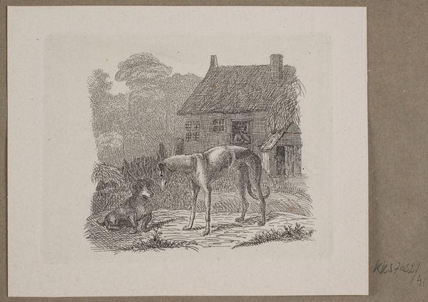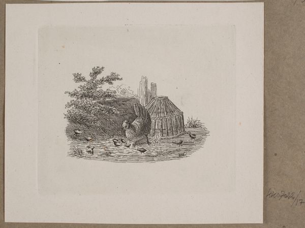 Editor: Here we have Vilhelm Kyhn’s "Illustration til O. Specter, \"Fabler for Børn\"" from 1838. It’s an engraving, a print – it feels playful but the landscape is so detailed! What strikes you about this piece? Curator: The composition commands immediate attention. The interplay of light and shadow, achieved through intricate linework, creates a dynamic visual field. Notice the textures – the thatched roof, the fur of the animals, the blades of grass. How do these elements contribute to the overall structure of the image, would you say? Editor: Well, they seem to create a very believable rural space. The textures make me feel like I could reach out and touch them, like the roof, for instance. Curator: Precisely! And observe how the artist employs line—thin, delicate strokes in the background contrasting with the denser, more assertive lines that define the foreground figures. This differentiation guides the viewer's eye and establishes a clear spatial hierarchy. Does the positioning of the dog and calf tell a specific story? Is their playful dynamic intended merely for decorative purposes? Editor: I assumed it told a fable of some sort. The dog is inciting the calf! It disrupts the traditional picturesque view of the landscape. I guess it goes with "fable for children" as something lighthearted and accessible. Curator: I would agree. The overt theme might be interpreted through this relationship between the animals; however, one could argue it only contributes to a certain dynamism – creating points, lines and planes on which our reading travels, so to speak. We can learn to think of these details less as 'illustrations', and more like the architecture that sustains its cultural purpose. Editor: That's interesting. Seeing it more as architecture than illustration changes my whole perspective on the artwork. I hadn't thought of it that way! Curator: Exactly! The intrinsic structure shapes how we extract extrinsic meaning. And I’m delighted you are coming away from it seeing differently!