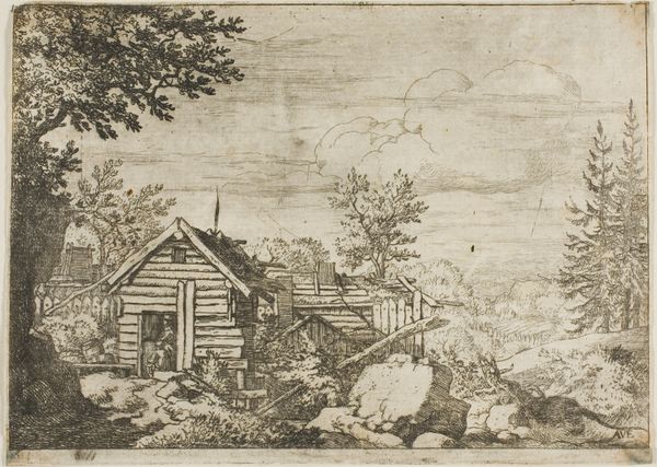 Curator: So, here we have "Landscape with Farmhouse and the Abduction of Ganymede," a striking engraving by Boëtius Adamsz. Bolswert, dating from around 1612 to 1614. It’s part of the Rijksmuseum's collection. Editor: The first thing that strikes me is the utter chaos hidden in the mundane! Look at this simple farmhouse scene, rendered so meticulously, but then...BAM! A tiny Ganymede is getting snatched right out of the sky! Curator: Exactly! The print blends the everyday with the mythological in such a Dutch Golden Age fashion. We see this peaceful rustic scene, rendered in delicate detail, with ordinary folk going about their day. And if you look carefully to the top-center you can see an eagle carrying Ganymede up to the heavens. Editor: That mythological insertion is wild! The artist juxtaposes that grandiose, dramatic abduction against the humdrum of rural existence. It makes you wonder: what goes unnoticed right under our noses every day? Also the contrast between such small-scale mythological figures against a rather plain naturalistic rendering creates an amusing tension, right? Curator: Absolutely, and I think the technique of engraving contributes to this contrast. Bolswert masterfully uses lines to create texture and depth, from the thatched roof of the farmhouse to the rolling hills in the background. This detailed precision adds to the feeling of groundedness and, in a way, highlights the surreality of Ganymede's abduction even more. Editor: The composition also draws me in. See how the path leads your eye toward the farmhouse and beyond into the horizon? The artist plays with perspective, creating depth in what would otherwise be a very flat image. And then, way up there, Ganymede becomes the point of focus of everything that is happening in the scene below. Curator: Yes, and the themes at play! A tranquil rural landscape juxtaposed with a dramatic, otherworldly event. It’s a curious blend of genres—landscape, genre scene, mythological narrative all rolled into one meticulously engraved print. I always love noticing things, even those we don’t understand. Editor: I get it. This piece speaks to the weird beauty of the world, doesn't it? To how even the most extraordinary things can happen amidst our daily routines. Curator: Precisely! A small reminder that life’s magic often lies in the unexpected details.