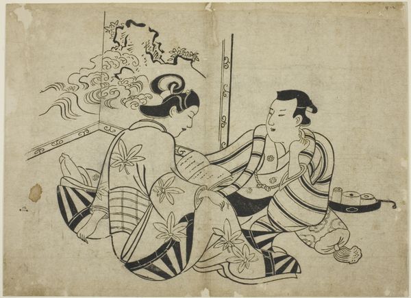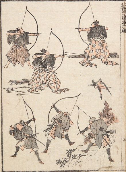 Editor: We’re looking at "The Tengu King Training his Pupils," a print by Hishikawa Moronobu from around 1690, crafted with ink on paper as a woodblock print. I’m struck by the energy – it's almost cartoonish in its depiction of movement, like frames from an old animation! What do you see in this piece? Curator: Ah, Moronobu. This print just bursts with a manic energy, doesn't it? Like a fever dream in black ink. To me, this work embodies a whimsical spirit and yet is subtly hinting at the disciplined training, suggesting an alternate take on military vigor through a lively depiction. I can't help but consider the context, a Japan finding its own cultural identity in the Edo period. Does the linear exuberance communicate that cultural vigor, would you agree? Editor: That's fascinating – the discipline hiding beneath the chaos! It almost feels… irreverent? Like a playful jab at the established order, the artist taking mythical characters out of historical context. Curator: Exactly! And that irreverence, it's a wink, isn’t it? Imagine those wings fluttering behind them as they negotiate balancing along that staff; not very serious warriors in that light! Also consider woodblock prints during this time, this art democratizing stories, taking it to the people through multiples. It’s like street art meets mythology. Don’t you think so? Editor: I didn't consider the rebellious aspect from the printing medium. Seeing it as this intersection is really exciting. So it's more than just mythical figures running around – it's social commentary disguised as a cartoon. Curator: Perhaps the magic and myth allows that social voice even further expression through symbolism. We see an embrace of native myth in this chaos, where this work speaks more deeply about social dynamism than simple aesthetics! I'd not looked so keenly until your fresh take offered it. Thanks!