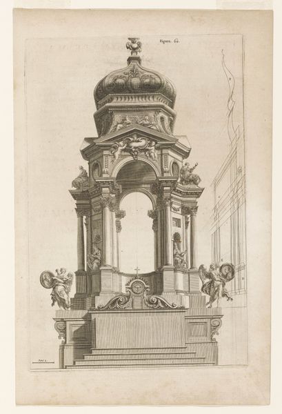 Editor: This is an anonymous drawing from between 1745 and 1805, titled "Colonnade and Fountain with a Crowned Armorial Shield." It's done with ink on paper and depicts a formal, classical cityscape. What do you see in this piece? Curator: I see an assertion of power and privilege, meticulously constructed within the visual language of Neoclassicism. Consider the very deliberate symmetry, the imposing colonnades, the heraldic shield prominently displayed at the top. It's a carefully orchestrated image designed to project authority. Who benefits from this idealized portrayal of urban space? Who is excluded? Editor: That’s a good point; it definitely feels…cold. What about the fountain? Does that soften the overall impression? Curator: Not necessarily. Fountains, in this era, weren’t merely decorative. They were often symbols of civic improvement, linked to displays of wealth and control over resources. Think about access – who had access to clean water, to these meticulously designed public spaces? Often, it mirrored existing social hierarchies. Editor: So you’re saying that even seemingly benign elements like the fountain can be interpreted as reinforcing social stratification? Curator: Precisely. And look at the architectural style itself. Neoclassicism, with its references to ancient Greece and Rome, was often employed by ruling elites to legitimize their power by associating themselves with idealized past empires. Editor: It’s amazing how much context can be embedded in a seemingly simple drawing. I’ll definitely look at Neoclassical art with a different perspective now. Curator: Understanding the socio-political context is key. Art doesn’t exist in a vacuum; it reflects, reinforces, and sometimes challenges the power dynamics of its time.