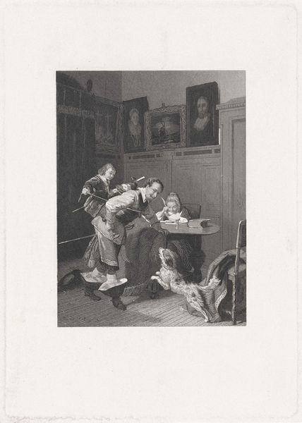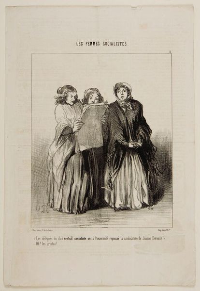 Editor: This is Honoré Daumier’s lithograph, "Insurrection against husbands is proclaimed as being the first and holiest duty in life!", from 1849. It's quite striking – a bit chaotic, but with such purposeful energy in the women's faces. I'm curious, what do you see as its primary message or impact? Curator: For me, this lithograph acts as a potent piece of social commentary viewed through a distinctly intersectional lens. Here, we are confronted with the anxieties surrounding emergent socialist and feminist thought in 19th-century France. Daumier is cleverly deploying caricature, but to what end? Do you think he's entirely dismissing these women? Editor: Well, their exaggerated features could be interpreted as mocking. But there's a defiance in their expressions that seems almost heroic. So perhaps there is admiration as well? Curator: Exactly! The phrase "Les Femmes Socialistes" sits at the top; we cannot ignore it. He is engaging with a particularly controversial discourse around women’s roles and their potential for disrupting patriarchal norms. The act of them grabbing at the hat, coded as masculine, highlights the tensions between domestic expectations and aspirations toward wider civic participation. Do you consider this a feminist artwork? Editor: I can definitely see the feminist reading, given the subject matter. However, the style - romanticism - isn't something I usually associate with feminist art, or social realism for that matter. Curator: Good point! Remember though, social movements are complex. Daumier presents a snapshot of a particular cultural moment, inviting us to think critically about these issues of class, gender and politics, rather than simply take sides. Editor: I see! So, it’s about sparking a discussion, more than pushing a specific agenda. Thanks! This was a really interesting way to contextualize the print! Curator: Precisely. By looking beyond the surface caricature, we’ve managed to untangle Daumier's nuanced critique and shed light on the turbulent social currents of his time.