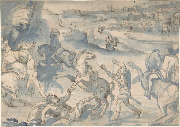 Andrea Andreani made this print, "Destruction of the Egyptian Army in the Red Sea", using the chiaroscuro woodcut technique. This involves carving multiple blocks to create a tonal image, a complex process demanding precision and skill. Andreani cuts his blocks to render forms by contrasting light and shadow, creating depth and drama. Note how the figures emerge from the chaos of the Red Sea, defined by stark tonal shifts. Woodcut, while capable of fine detail, often bears the mark of the tool. Look closely, and you can see the parallel lines, a by-product of the cutting process itself. The graphic nature of the image reinforces the story's drama, where a grand army meets its end. Such prints were relatively affordable, making biblical narratives accessible to a wider audience. Andreani’s print sits at the intersection of art, craft, and commerce, reflecting both technical mastery and the demands of his time. By emphasizing materials, making, and context, we gain a richer sense of the artist's aims.